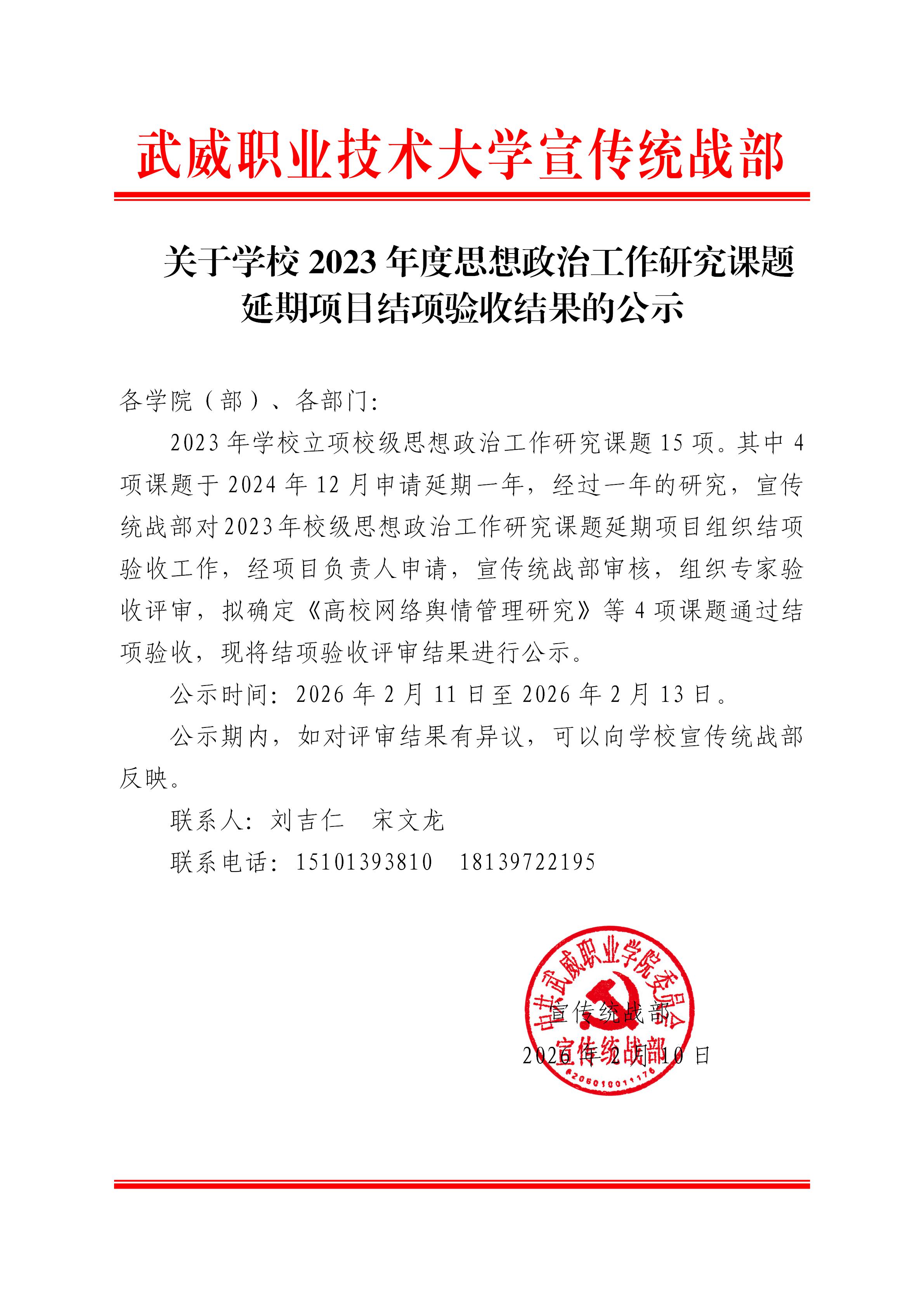 關(guān)于學(xué)校2023年度思想政治工作研究課題延期項目結(jié)項驗收結(jié)果的公示