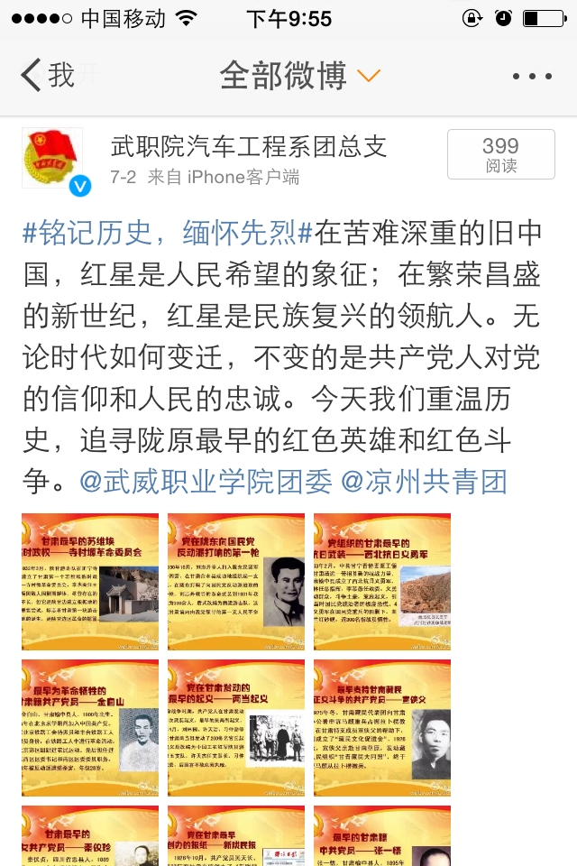 新媒體是對團員青年進行宣傳教育的一塊重要的輿論陣地,汽車工程系團總支通過青媒中心設立的微信公眾平臺、新浪微博、QQ空間等多種手段,通過發(fā)布中國人民抗戰(zhàn)歷史知識、設立紀念抗日戰(zhàn)爭70周年話題等多種形式,以圖文并茂的方式給團員青年進行了一次中國人民抗戰(zhàn)大普及和大討論,使團員青年在學習知識和討論觀點中,堅定理想信念,培養(yǎng)愛國情操、樹立歷史使命、珍惜美好生活、勿忘國恥,展望未來。