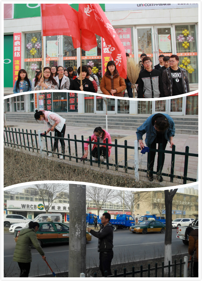 電子信息工程系團(tuán)總支結(jié)合團(tuán)市委、院團(tuán)委《關(guān)于開展城鄉(xiāng)環(huán)境衛(wèi)生整治青年志愿服務(wù)活動的通知》安排,3月3日下午16:30組織20名團(tuán)員青年在學(xué)院北門口道路兩側(cè)開展了衛(wèi)生死角清掃,柵欄清潔,果皮箱清潔,公交站臺清潔,小廣告清理,垃圾清運。學(xué)生志愿者盡己所能,服務(wù)社會,傳播勞動信念,為建設(shè)美好社會貢獻(xiàn)自己的一份微薄力量。