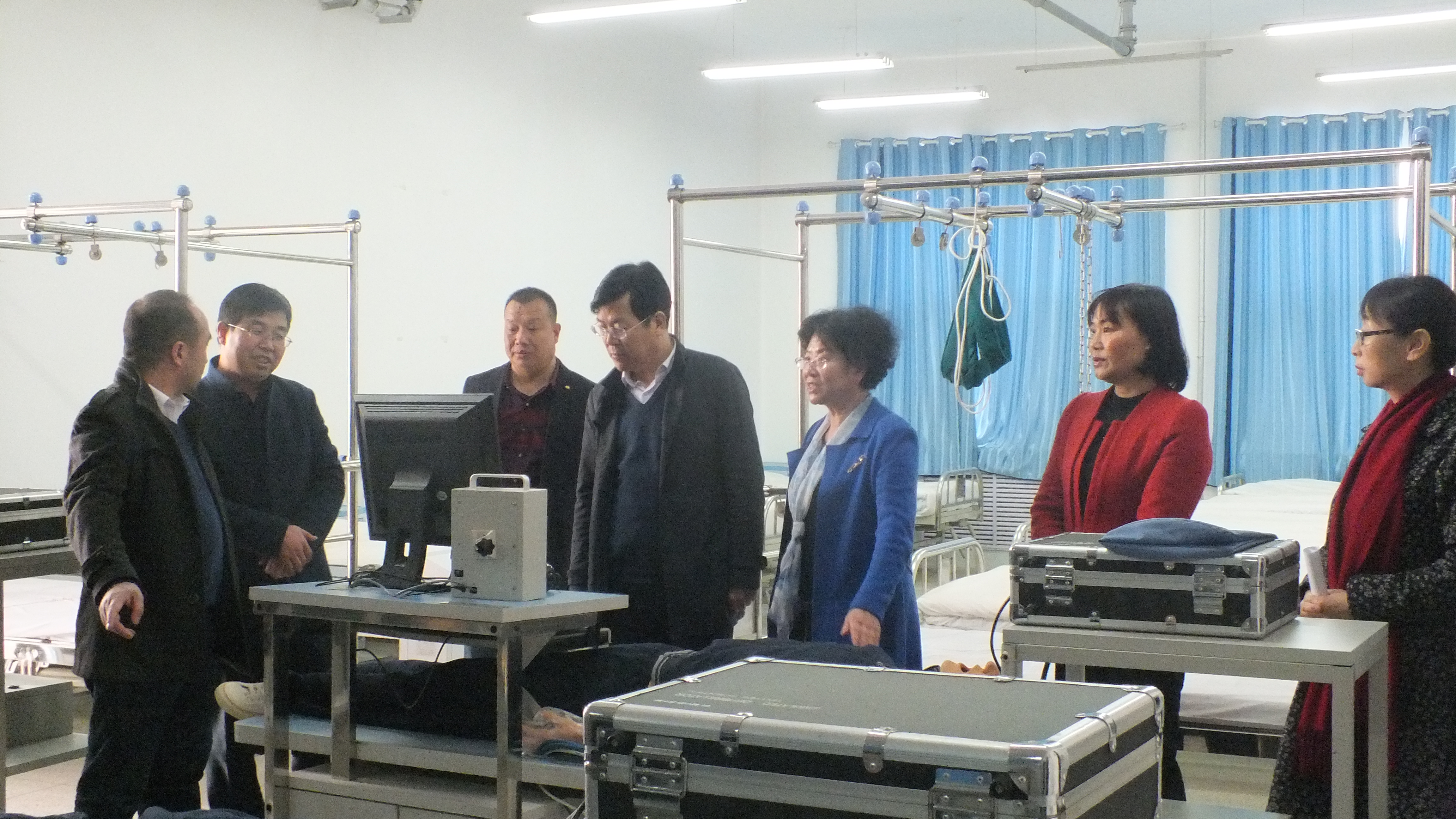 毛校長(zhǎng)一行參觀了護(hù)理系的生命科技館、機(jī)能實(shí)訓(xùn)室、基護(hù)實(shí)訓(xùn)室、內(nèi)外科實(shí)訓(xùn)室等醫(yī)學(xué)類(lèi)實(shí)訓(xùn)室,詳細(xì)了解了實(shí)驗(yàn)設(shè)備的運(yùn)行情況和實(shí)驗(yàn)實(shí)訓(xùn)課程的教學(xué)管理模式。潘玉華向來(lái)賓們介紹了學(xué)院申辦臨床醫(yī)學(xué)專(zhuān)業(yè)的進(jìn)展,以及我院實(shí)訓(xùn)課程建設(shè)和籌建實(shí)驗(yàn)實(shí)訓(xùn)室取得的成果。