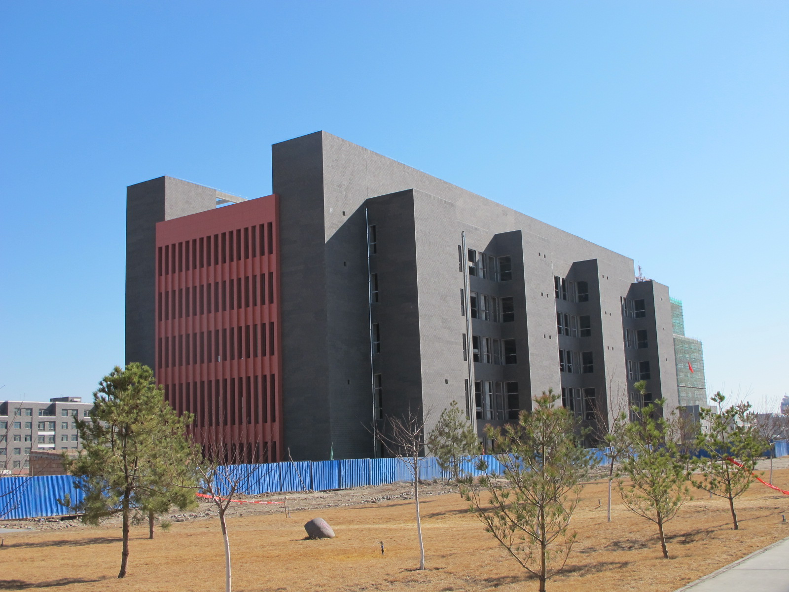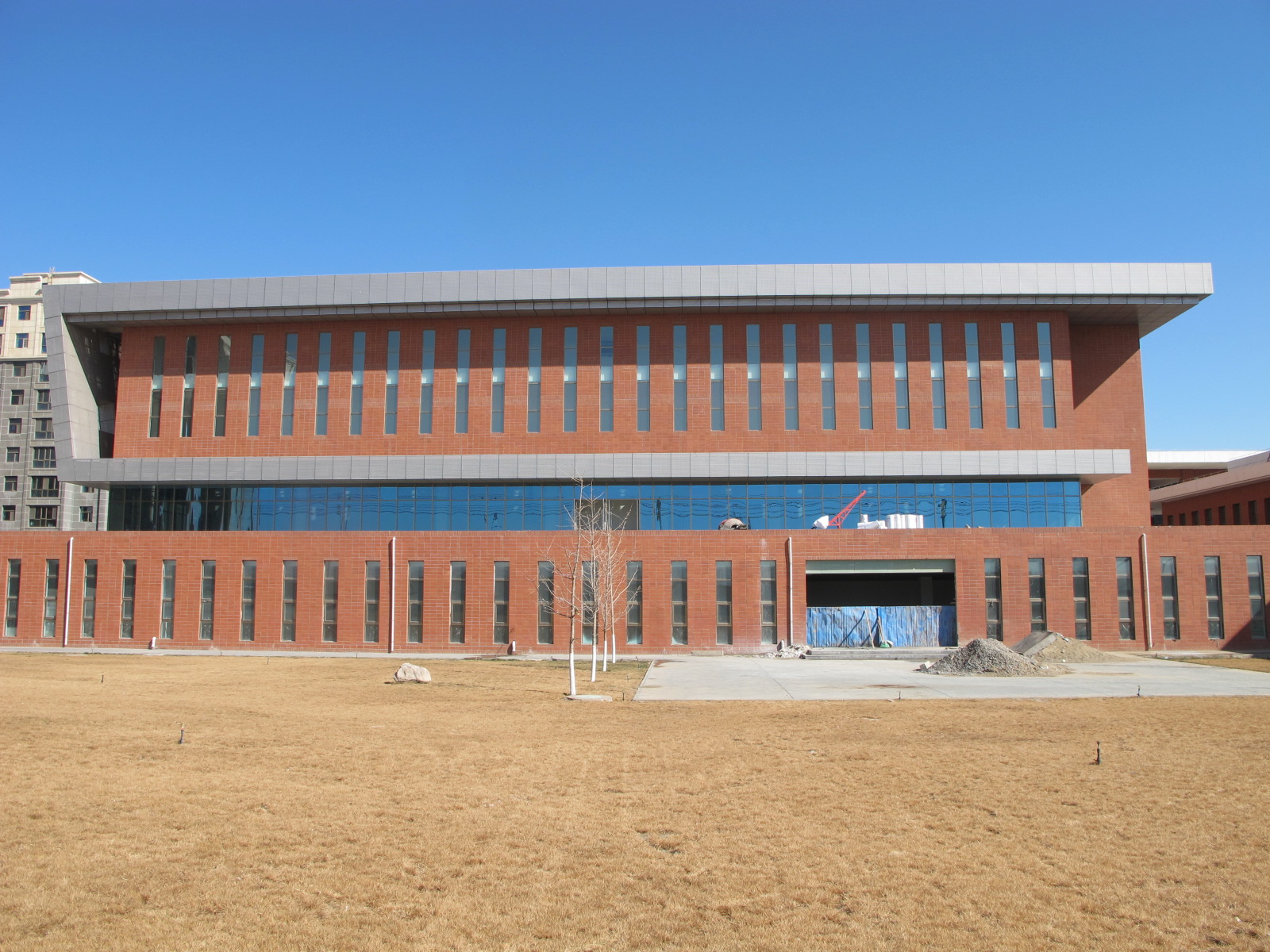 體育館建設(shè)項(xiàng)目已完成外立面檐口的安裝,采用銀灰色2.5mm厚氟碳沖孔鋁單板,已完成玻璃幕墻的安裝,外立面盡顯端莊大氣。復(fù)工后,進(jìn)行一層上人屋面的防水層施工和防滑磚的鋪設(shè),完成一層頂女兒墻玻璃扶手的安裝。圖書館建設(shè)項(xiàng)目已完成外墻陶土劈開磚的粘貼、東西兩側(cè)外立面鋁板裝飾施工。復(fù)工后,繼續(xù)進(jìn)行內(nèi)部施工及裝修。