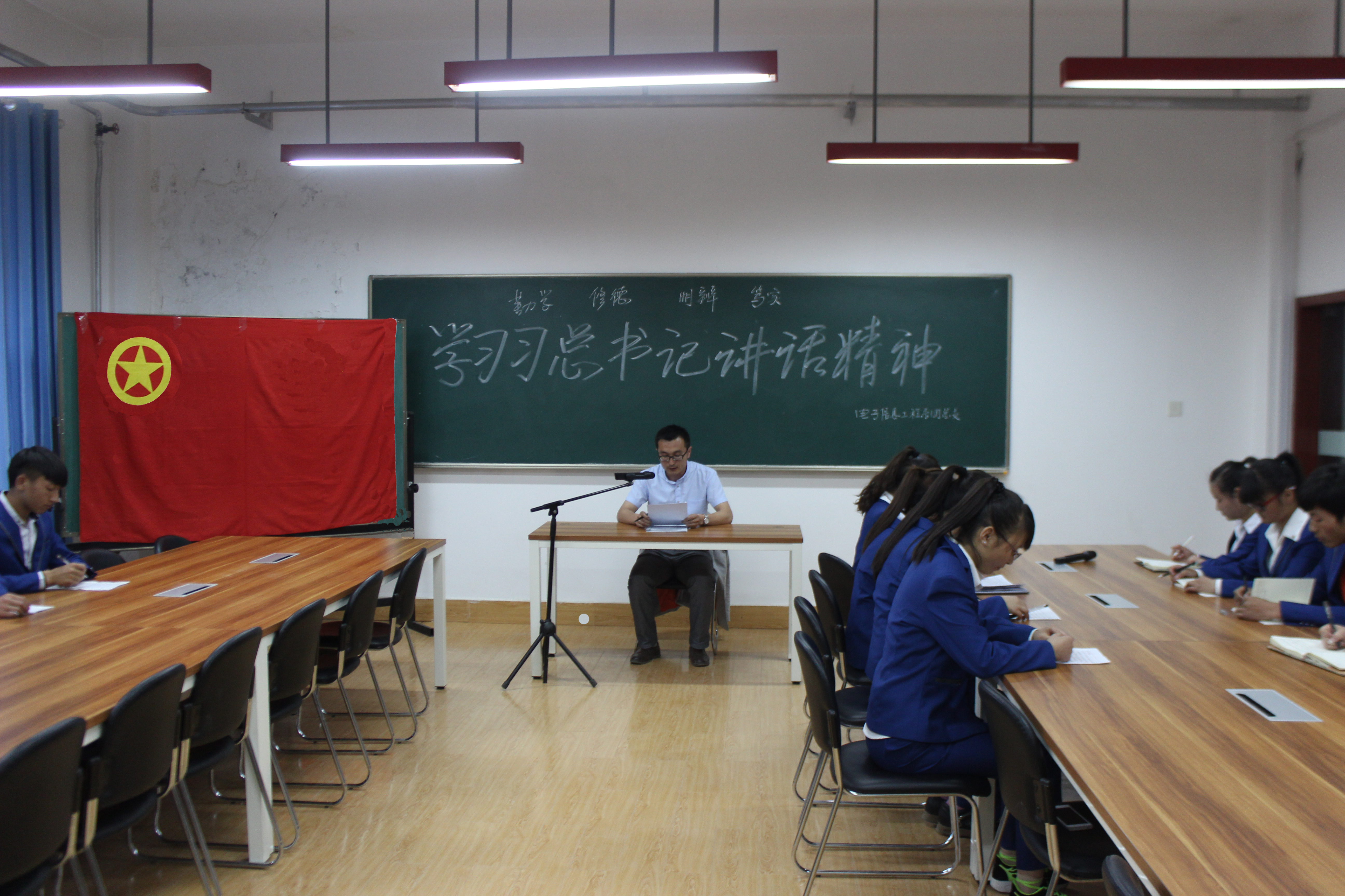 為使學(xué)生更好地學(xué)習(xí)和踐行習(xí)近平總書記的系列講話精神,牢固同學(xué)們對黨的科學(xué)理論的信仰,電子信息工程系團(tuán)總支于2015年5月5日在尚德樓5樓計(jì)算機(jī)教研室開展學(xué)習(xí)習(xí)近平總書記講話精神“四進(jìn)四信”活動暨“如何練好習(xí)大大傳授的‘八字真經(jīng)’”主題團(tuán)日活動,活動由電子信息工程系團(tuán)總支書記唐宗舜老師主持,各班團(tuán)學(xué)干部參加活動。