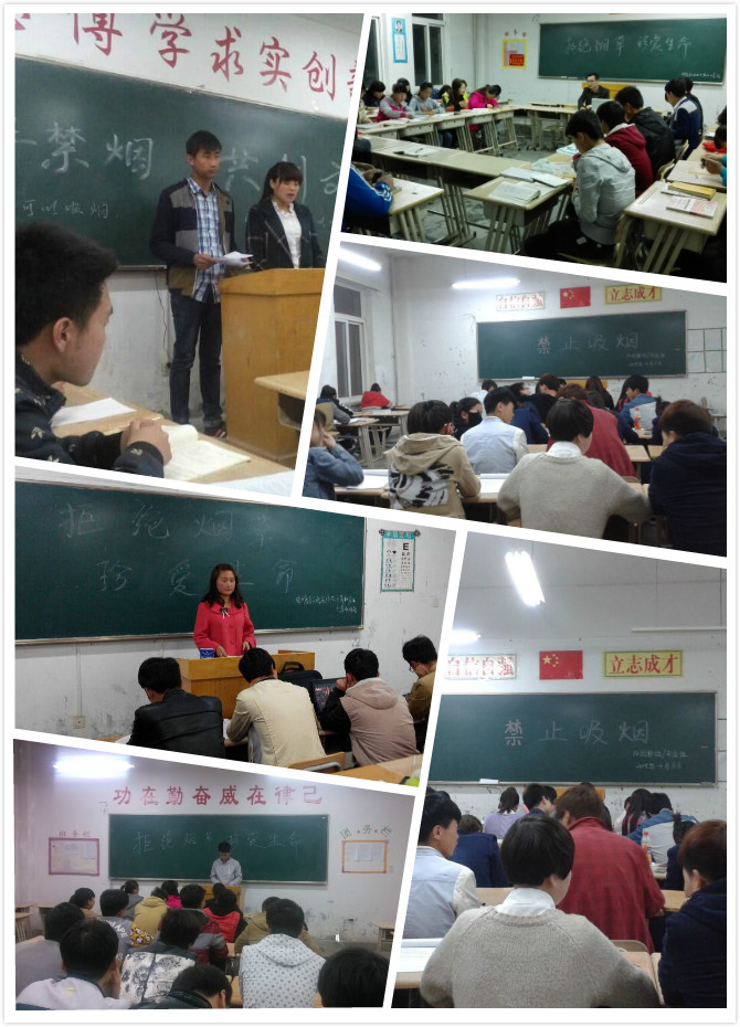 在班會中,各班主任向同學們宣讀了學院《關于在校園內公共場所戒煙的通知》和《校園禁煙倡議書》,并提出作為一名學生,除了要有遠大的理想、高尚的情操、淵博的知識、嚴謹?shù)募o律作風外,還要有一個健康的身體。為了我們的健康,我們呼吁,同學們應自覺的遠離香煙,并勸說吸煙的親友盡快戒煙。讓我們每一位同學做出承諾,自覺拒絕煙草,遠離煙草危害。堅決不吸煙,拒吸第一支煙,勸告他人不吸煙,不做吸煙的新一代。人人爭做文明、健康、遵紀守法的好學生,使每一位師生都擁有一個健康的生活環(huán)境。