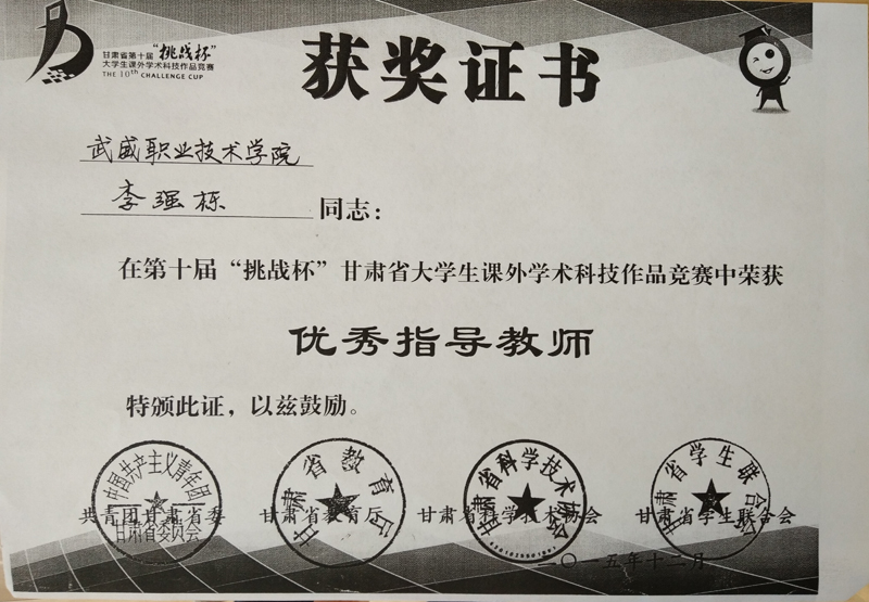 2015年6月23日,現(xiàn)代農(nóng)業(yè)技術(shù)系教師蔡海、李強(qiáng)棟赴西北師范大學(xué),參加由共青團(tuán)甘肅省委、甘肅省教育廳、甘肅省科學(xué)技術(shù)學(xué)會、甘肅省學(xué)生聯(lián)合會舉辦的甘肅省第十屆大學(xué)生“挑戰(zhàn)杯”大學(xué)生課外學(xué)術(shù)科技作品競賽,獲得優(yōu)秀指導(dǎo)教師榮譽(yù)稱號。