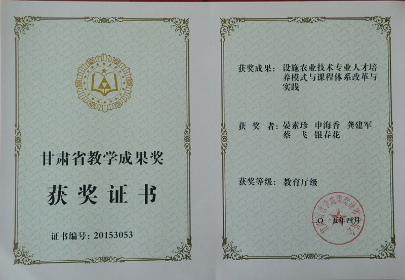 2015年甘肅省教學成果獎:設施農(nóng)業(yè)技術專業(yè)人才培養(yǎng)模式與課程體系改革與實踐