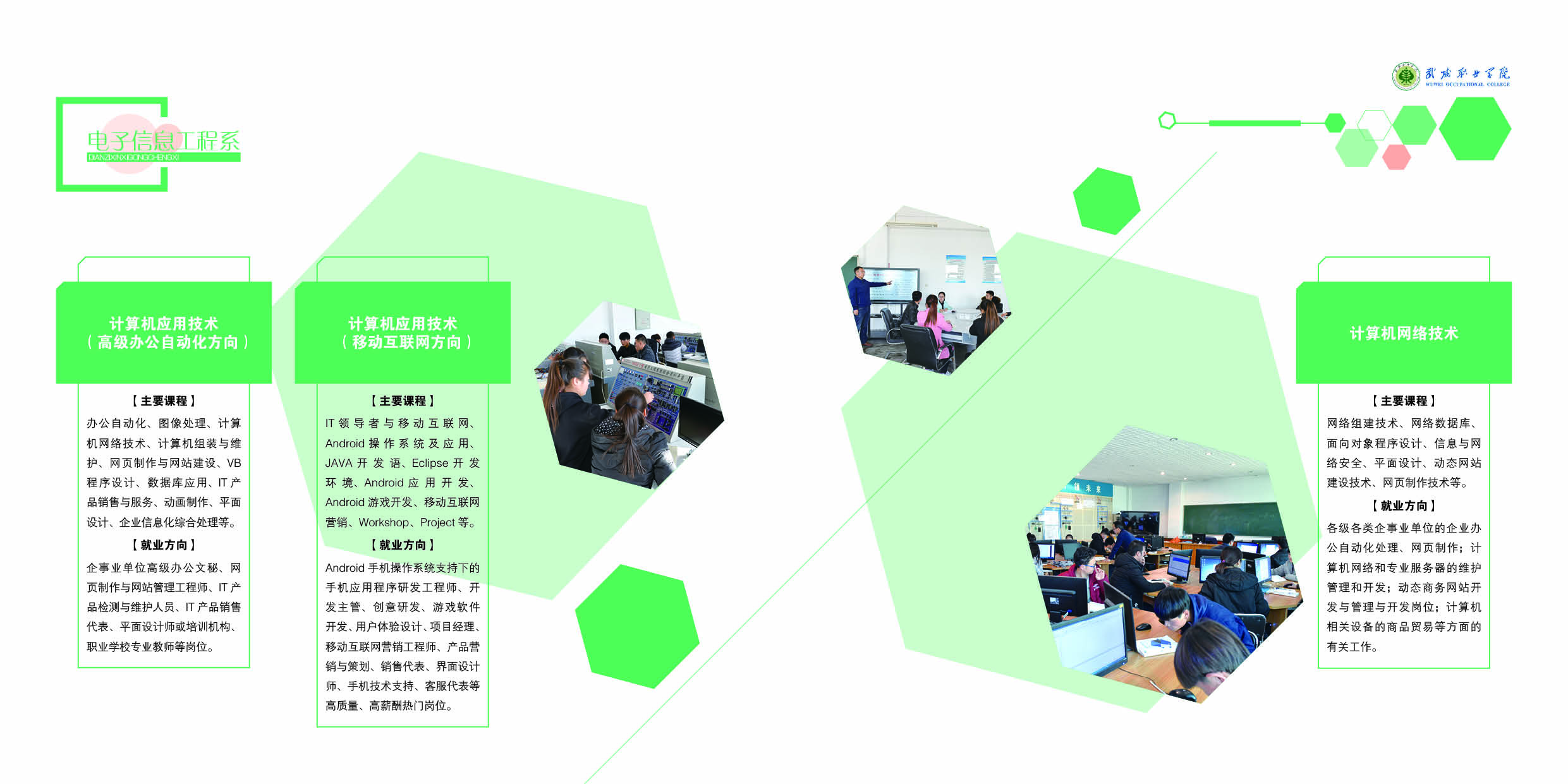 主要課程:辦公自動(dòng)化、圖像處理、計(jì)算機(jī)網(wǎng)絡(luò)技術(shù)、計(jì)算機(jī)組裝與維護(hù)、網(wǎng)頁(yè)制作與網(wǎng)站建設(shè)、VB程序設(shè)計(jì)、數(shù)據(jù)庫(kù)應(yīng)用、IT產(chǎn)品銷(xiāo)售與服務(wù)、動(dòng)畫(huà)制作、平面設(shè)計(jì)、企業(yè)信息化綜合處理等。