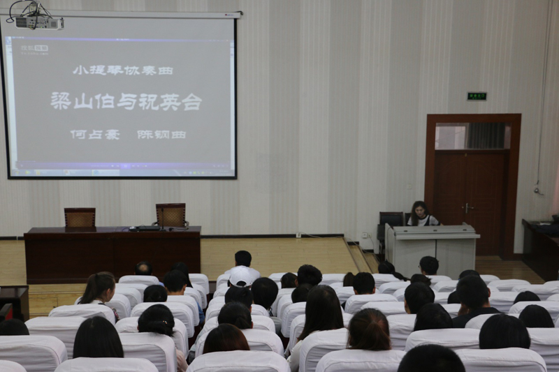 伴著優(yōu)美的音樂(lè)旋律王敏副教授開(kāi)始了講座,王老師首先介紹了音樂(lè)發(fā)展歷史和音樂(lè)鑒賞的基礎(chǔ)知識(shí),然后以我國(guó)著名作曲家陳鋼、何占豪先生創(chuàng)作的小提琴協(xié)奏曲《梁山伯與祝英臺(tái)》為題材,分階段講述了“鳥(niǎo)語(yǔ)花香”、“草橋結(jié)拜”、“英臺(tái)抗婚”、“投墳化蝶”等內(nèi)容和藝術(shù)場(chǎng)景。剖析了作品在管樂(lè)、和以小提琴、大提琴為主的弦樂(lè)及民樂(lè)有機(jī)結(jié)合的高超藝術(shù)境界,講座過(guò)程中王老師結(jié)合《梁?!穮f(xié)奏曲音視頻資料,演繹了梁山伯與祝英臺(tái)凄美的愛(ài)情故事。