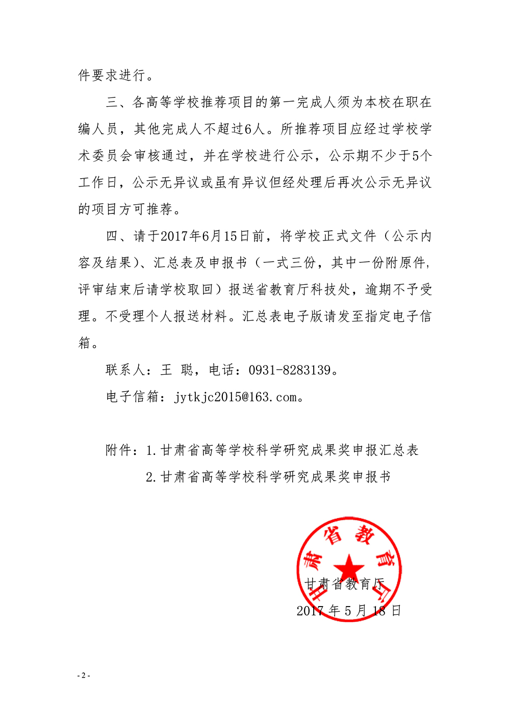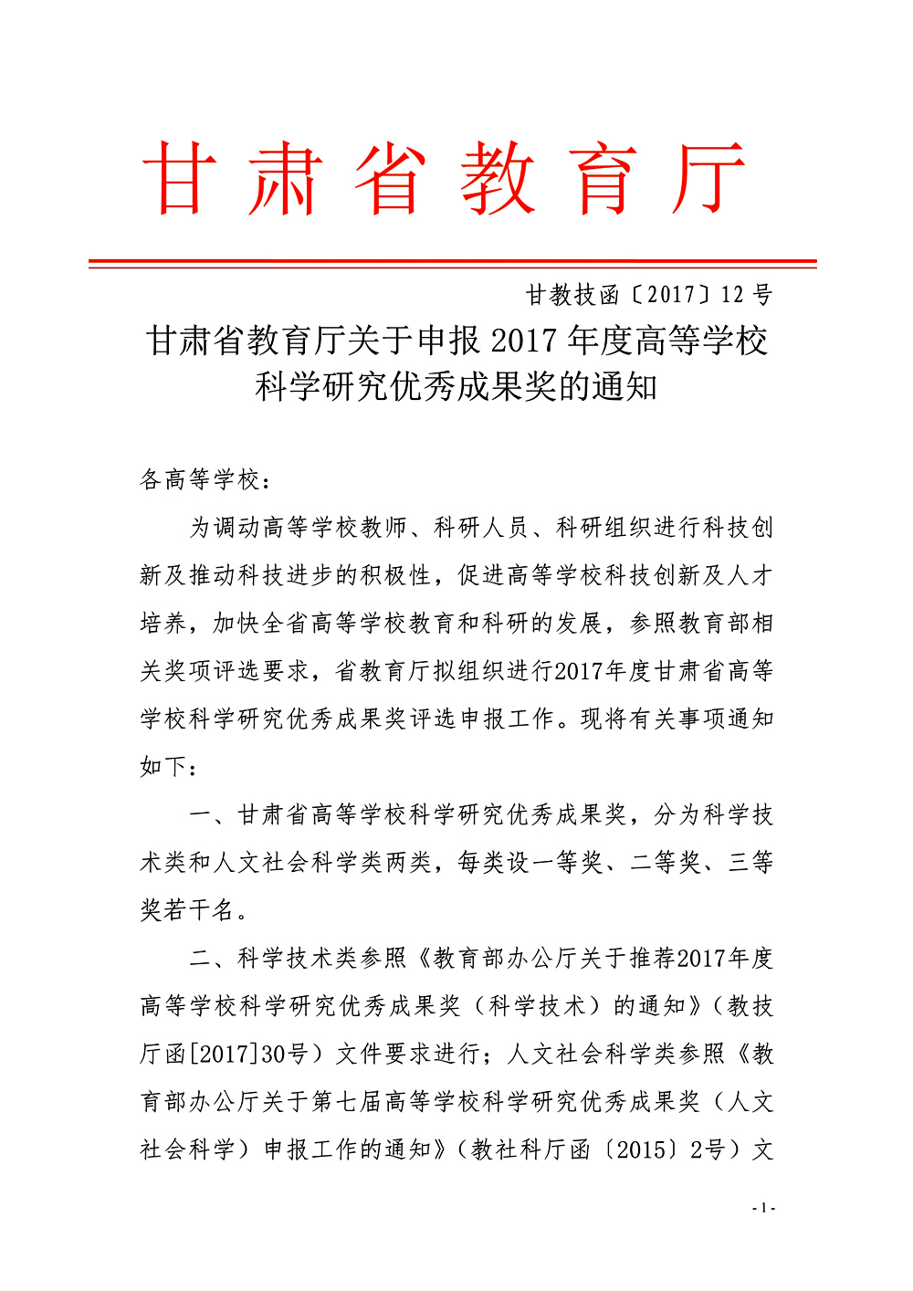 轉(zhuǎn)發(fā)甘肅省教育廳關(guān)于申報2017年度高等學??茖W研究優(yōu)秀成果獎的通知