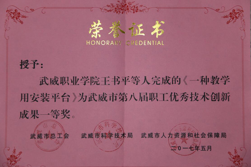 為貫徹落實武威市委、市政府關于《武威市十萬職工職業(yè)技能素質(zhì)提升活動工作方案(2016-2020年)》(武政辦發(fā)〔201672號)文件精神,推動我市“雙創(chuàng)”工作的深入開展,激發(fā)我市廣大企事業(yè)職工提升技能和開拓創(chuàng)新的熱情。近日,由市總工會、市人社局、市科技局等單位聯(lián)合舉辦了“武威市第八屆職工技術創(chuàng)新成果評選活動”。本屆職工技術創(chuàng)新成果評選共征集創(chuàng)新成果87項,其中:學院推薦了十項研究課題、專利技術項目,王書平團隊《一種教學用安裝平臺》項目成果榮獲一等獎,申賓德團隊《簡易焊工考試用帶坡口鋼板火焰切割下料機的研究與應用》,王勝團隊《“胰美舒”治療2型糖尿病周圍神經(jīng)病變(氣陰兩虛兼瘀證)的臨床觀察》項目成果榮獲三等獎。