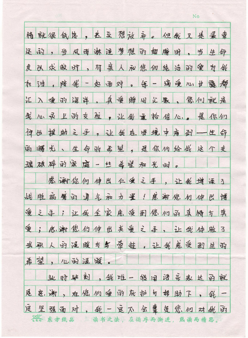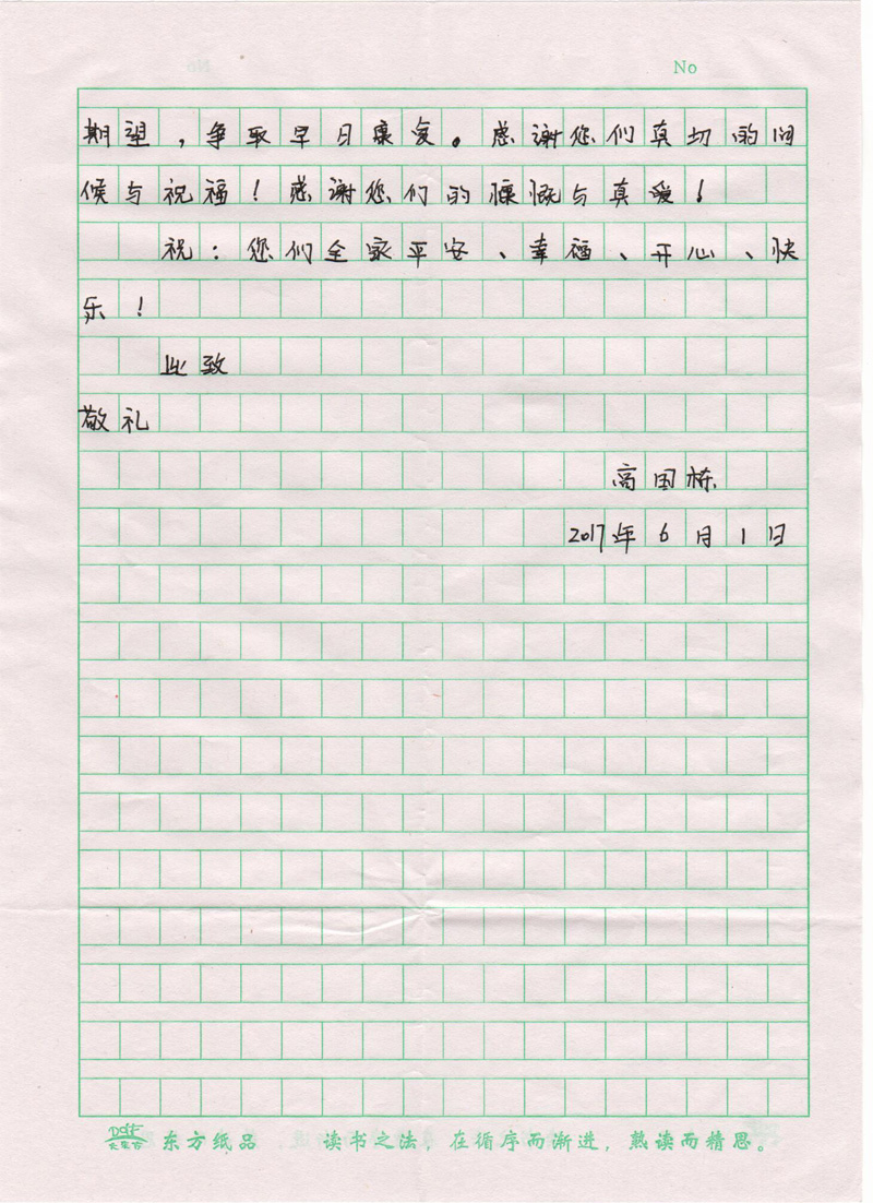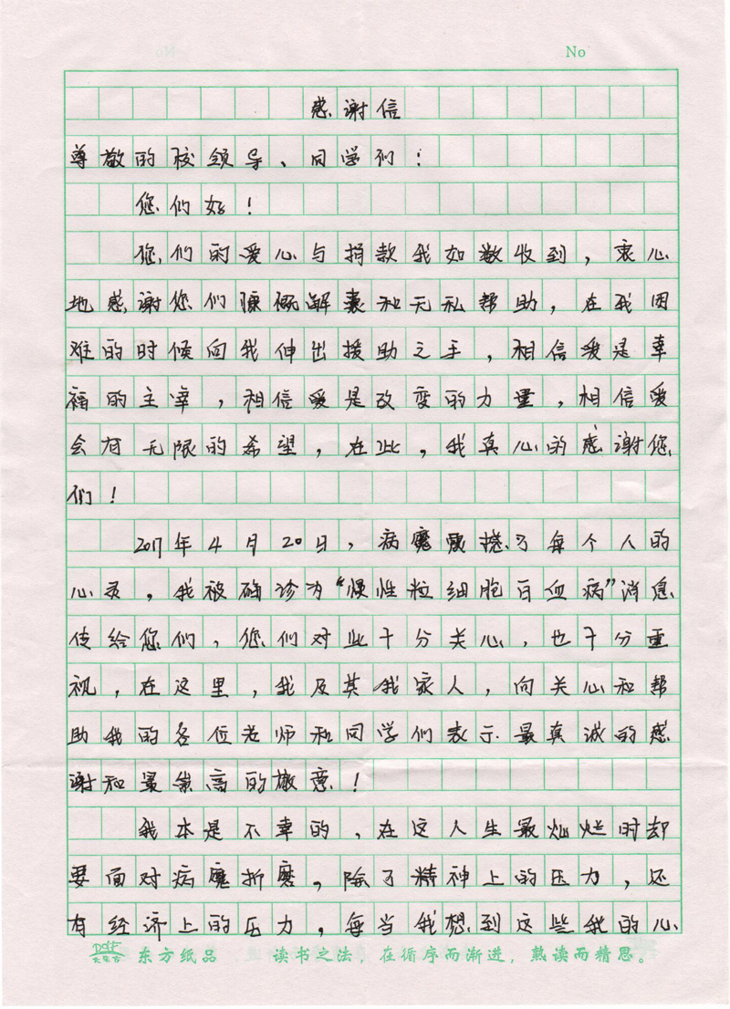 高國棟是我院機械制造系2015級機械設(shè)計與制造大專班學(xué)生,于2017年4月確診為慢性粒細胞白血病。得知這一特殊情況后,學(xué)院宣傳統(tǒng)戰(zhàn)部、團委、學(xué)生工作處第一時間向全院廣大師生發(fā)出倡議,號召大家獻出愛心,幫助高國棟同學(xué)度過難關(guān)。學(xué)院廣大師生紛紛解囊,慷慨相助。目前捐助的善款已經(jīng)交給高國棟同學(xué)。為此,高國棟同學(xué)特意寫來感謝信,表達對母校廣大師生的感激之情。在此,我們衷心祝愿高國棟同學(xué)能在困境中迎難而上,樹立戰(zhàn)勝疾病的信心,爭取早日康復(fù),重返校園。