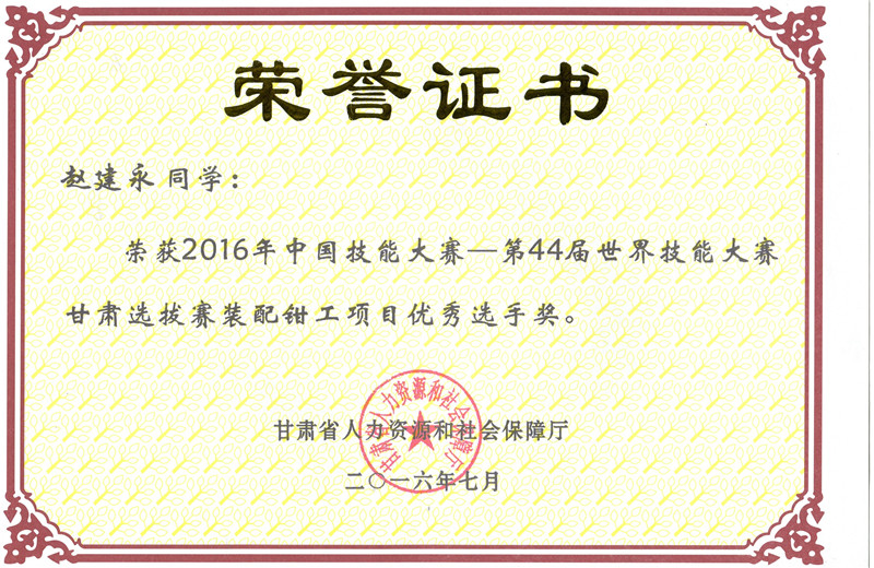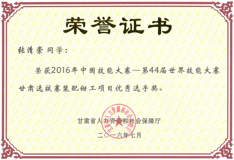 第44屆世界技能大賽甘肅選拔賽裝配鉗工項(xiàng)目優(yōu)秀獎(jiǎng)