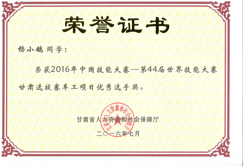 第44屆世界技能大賽甘肅選拔賽車工項(xiàng)目?jī)?yōu)秀獎(jiǎng)