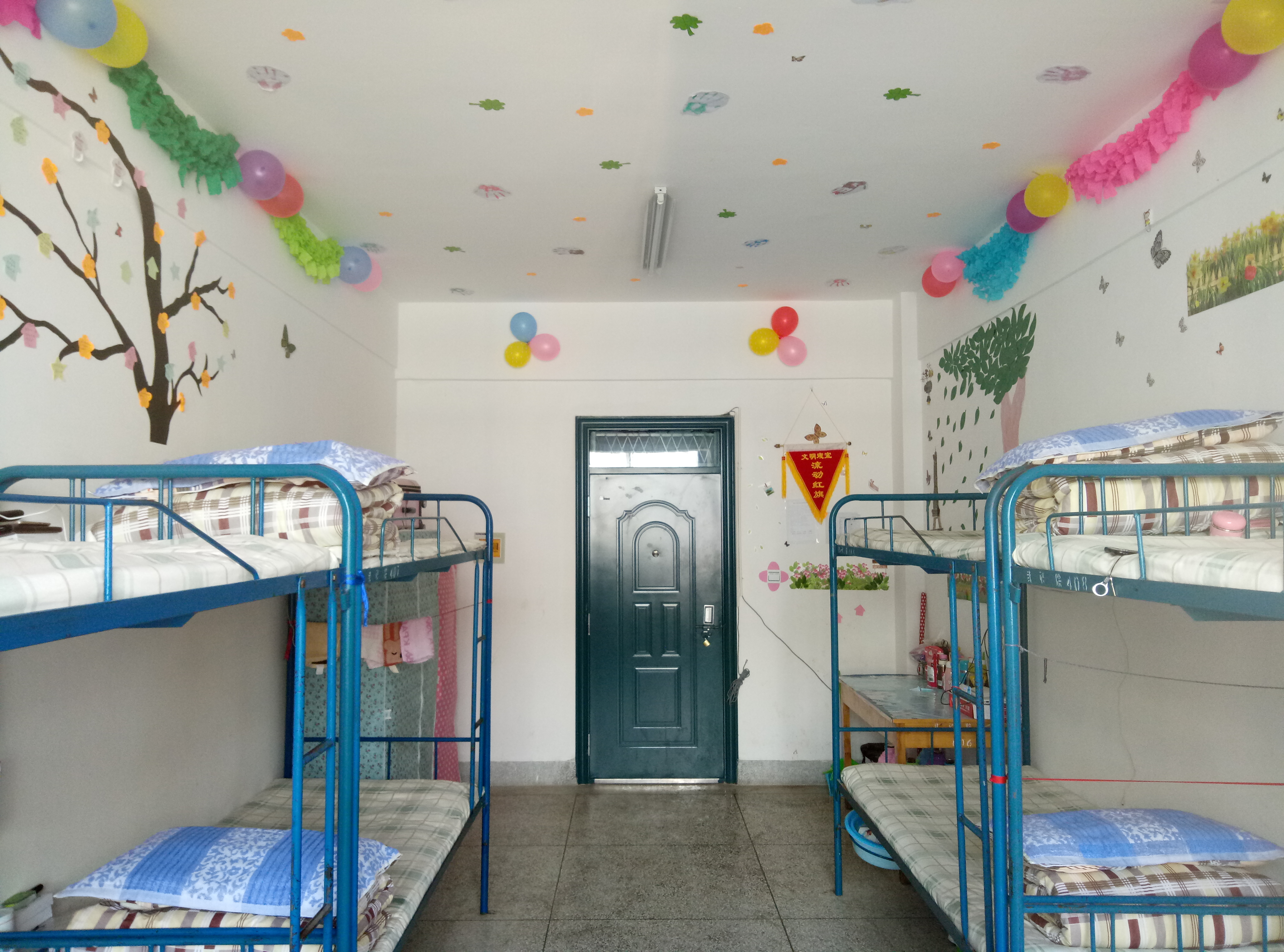 各宿舍衛(wèi)生狀況普遍較好,基本做到了勤開窗,勤掃除,被褥疊放整齊,地面、桌面干凈整潔,用電合理、安全。同學們大膽創(chuàng)新利用剪紙、剪花、圖貼等手工作品將宿舍裝扮得優(yōu)雅而漂亮。也有同學用書法、繪畫作品裝扮宿舍,為宿舍增添了藝術(shù)的氣息。