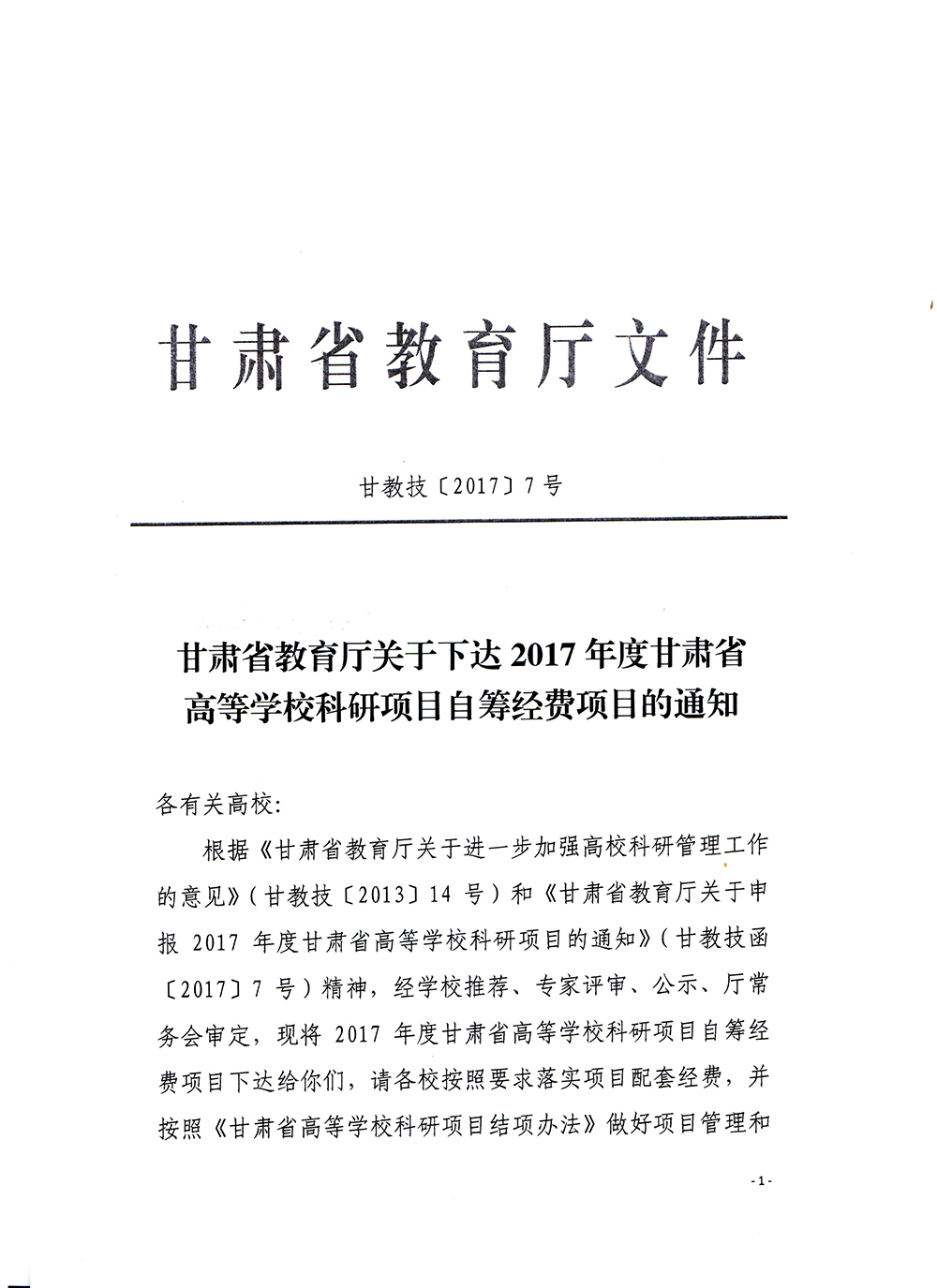 轉(zhuǎn)發(fā)甘肅省教育廳《關(guān)于下達2017年度甘肅省高等學??蒲许椖孔曰I經(jīng)費項目的通知》