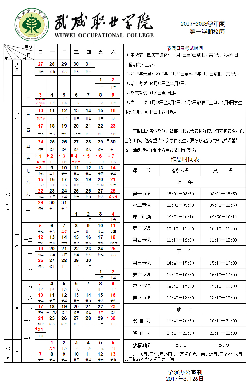 2017-2018學(xué)年度第一學(xué)期校歷