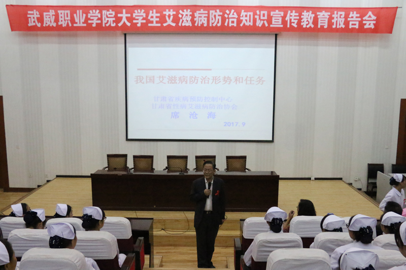 9月21日晚,甘肅省性病艾滋病防治協(xié)會(huì)副會(huì)長(zhǎng)、甘肅省艾滋病首席專(zhuān)家、主任醫(yī)師席倉(cāng)海教授在學(xué)院正德廳為我院學(xué)生作了一場(chǎng)“大學(xué)生艾滋病防治知識(shí)宣傳教育”講座,講座由市疾控中心主任楊天琳主持,學(xué)院護(hù)理系黨總支書(shū)記張建輝、市疾控中心性病艾滋病科科長(zhǎng)王永瑚、市中心血站血源科科長(zhǎng)邢志勇及學(xué)院各級(jí)團(tuán)干部和紅絲帶協(xié)會(huì)共280多人聆聽(tīng)了講座。