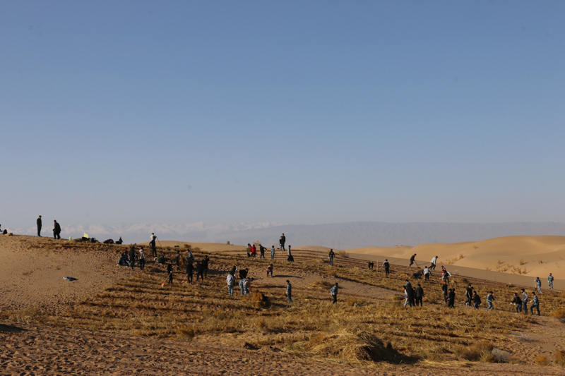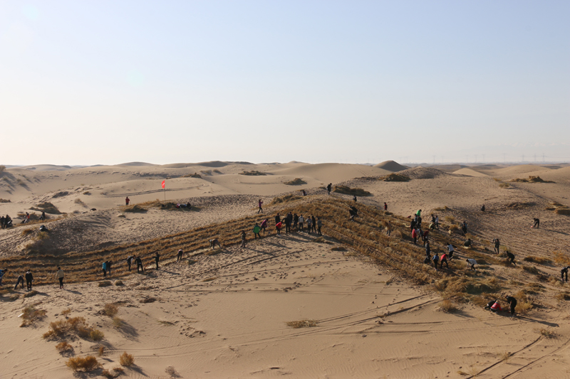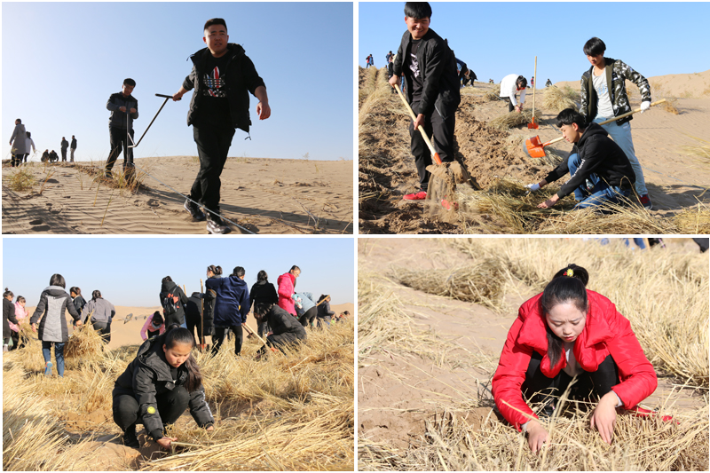 在勞動(dòng)現(xiàn)場(chǎng),學(xué)院領(lǐng)導(dǎo)和師生們不畏冬寒,分工協(xié)作,按照標(biāo)準(zhǔn)和要求劃線開溝、蒲草培沙、等距離推進(jìn),現(xiàn)場(chǎng)一片熱火朝天的景象?;氖彽纳车厣砼乱拢R的稻草方格逐漸向遠(yuǎn)處的沙丘覆蓋。