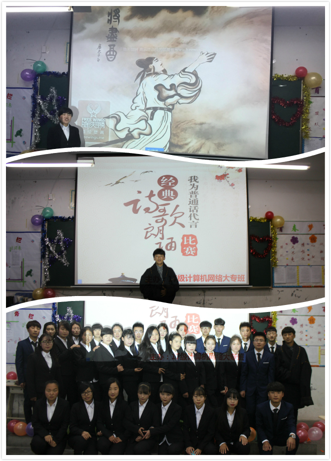 為了弘揚(yáng)中華民族傳統(tǒng)文化,倡導(dǎo)學(xué)生立德修身,培育愛國情操,2017年11月20日,17級計(jì)算機(jī)網(wǎng)絡(luò)大專班舉辦了主題為“傳承中華文化,共筑青春夢想”經(jīng)典詩歌誦讀比賽。